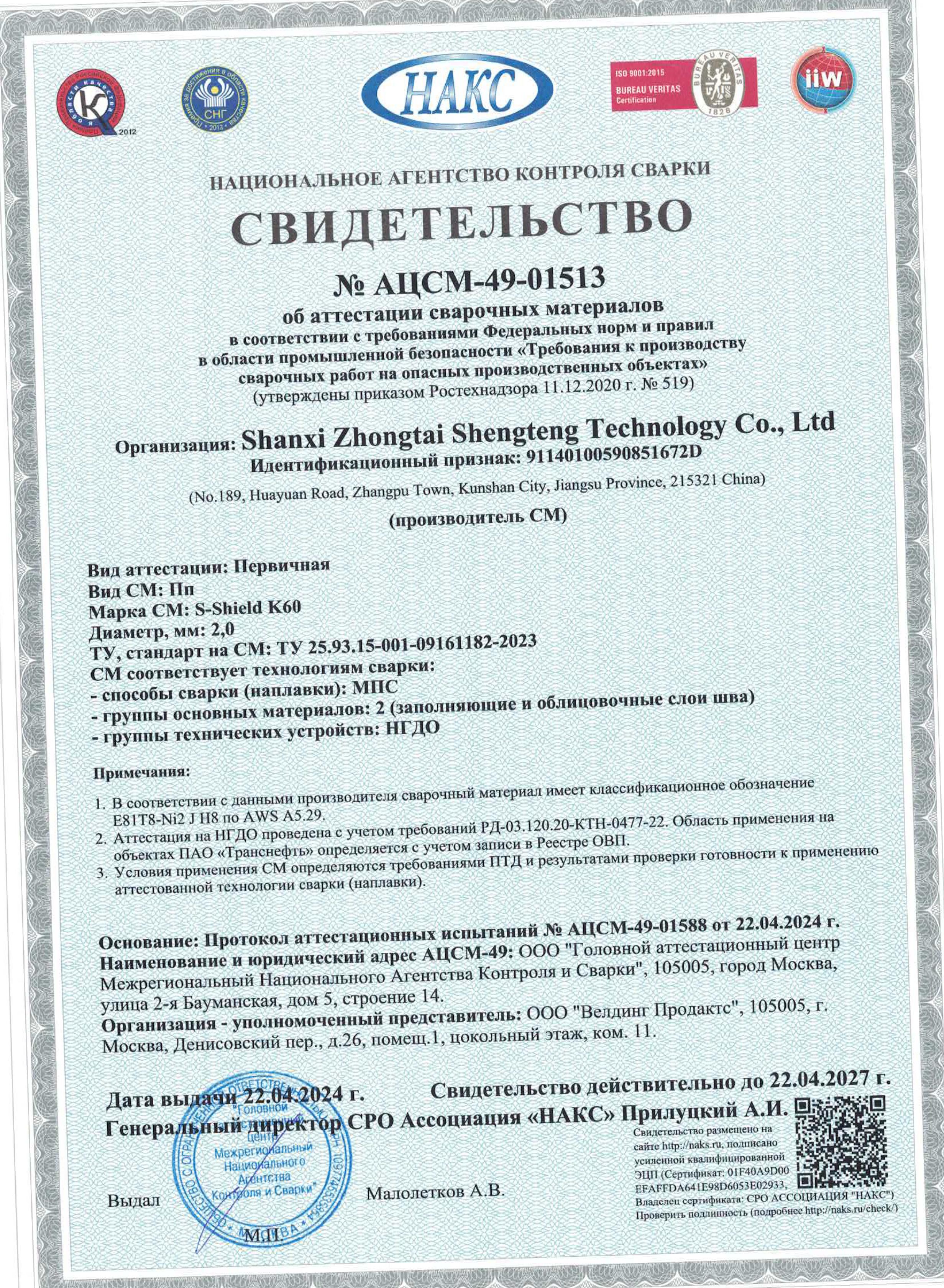 Самозащитная порошковая проволока S-Shield K60 вошла в реестр ОВП ПАО «Транснефть» и получила НАКС с учетом требований ПАО «Транснефть»